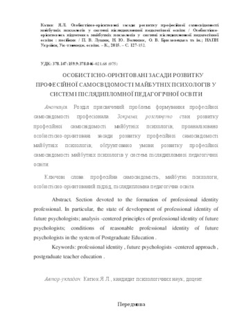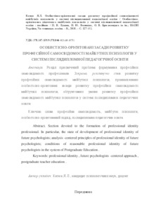 Section devoted to the formation of professional identity professional. In particular, the state of development of professional identity of future psychologists; analysis -centered principles of professional identity of future psychologists; conditions of reasonable professional identity of future psychologists in the system of Postgraduate Education.
