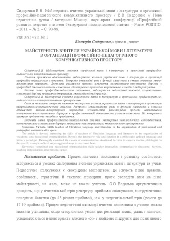 - Сидоренко, В.В. (2011) Skills teacher of Ukrainian language and literature in the organization of professional and pedagogical communicative space. Нова педагогічна думка, 2. pp. 90-98.