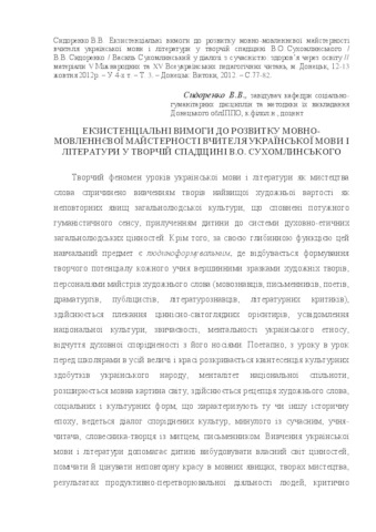 - Сидоренко, В.В. (2012) Existential requirements for the development of language and speech skills teacher of Ukrainian language and literature in a creative heritage VA Sukhomlynsky Василь Сухомлинський у діалозі з сучасністю: здоров’я через освітую. Матеріали V Міжнародних та XV Всеукраїнських педагогічних читань, 3. pp. 77-82.