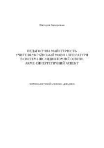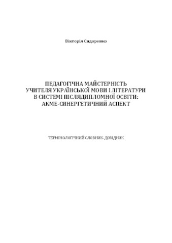 Glossary Directory pedagogical skills of teachers of Ukrainian language and literature concluded for the first time. It collected and systematized acmeological basic concepts, scientific categories paradigm context is directly linked to the continuous professional and personal growth teacher of Ukrainian language and literature in the system of postgraduate education, improving his professional and pedagogical competence acquisition professionally significant competences, development of new quality vocational and educational actions in accordance with the objectives of the revised language and literary paradigm. For scientists, staff of higher education institutions, organizers of postgraduate education, training courses teaching staff, heads of secondary schools and institutions of secondary education, as well as all those interested in the modernization of the national system of Postgraduate Education.