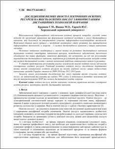 - Кравцов, Г.М., Вінник, М.О. and Тарасіч, Ю.Г. (2013) Research of influence of quality of electronic educational resources on quality of training with use of distance technologies Journal of Information Technologies in Education, 1 (16). pp. 83-94. ISSN 2306-1707 (online), 1998-6939 (in print)