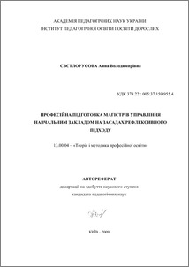 The dissertation is theoretical-experimental research of problem of vocational training of master's degrees educational managers on the basis of reflection approach. Professional preparation of master's degrees on bases of reflection approach is directed on development of administrative reflection, that foresees application of complex of specially neat forms and methods of studies, directed on development at the students of ability competently to operate in accordance with the factors of the external and internal influencing.