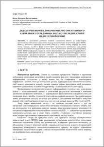 In the study the concepts of “didactic requirements for computer oriented learning environment of Postgraduate education establishment” was specified, identified specific teaching requirements for computer oriented learning environment of post-graduate teacher education, including the objectives, content, means and forms of computer-based learning environment of Postgraduate education. Also grounded the requirement for creation of Computer oriented learning environment of post-graduate teacher education taking into account comfort, health and life-saving conditions, professional and personal characteristics of students, new role of teachers, implementation and management of credit-modular system of teaching and learning process of post-graduate teacher education computer oriented learning environment.