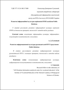 - Гуменний, О.Д. (2012) Development of information culture of professional managers are the means of Public Relations Вісник Луганського національного університету імені Тараса Шевченка, 22 (257). pp. 144-152. ISSN 2222-2844