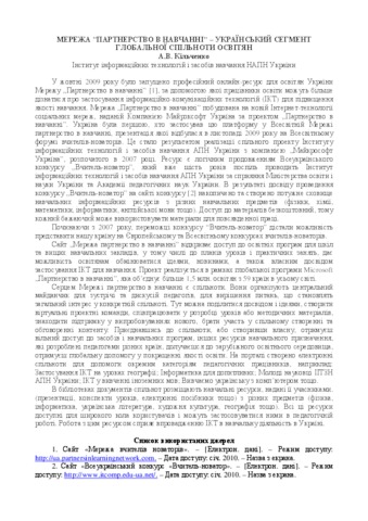 - Кільченко, А.В. (2010) «Partners in Learning Network» is the Ukrainian segment of global association of teachers In: Тези доповідей VІІ Всеукраїнської науково-практичної конференції «Інформаційні технології в освіті, науці і техніці» (ІТОНТ-2010) (2). Черкаський державний технологічний університет, м.Черкаси, Україна, p. 11.
