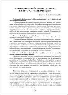 - Чепелєва, Н.В. and Яковенко, Л.П. (2011) Вплив смислової структури тексту на його розуміння читачем Актуальні проблеми психології, 7 (2). pp. 79-89. ISSN 2072-4772