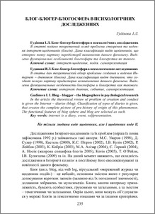 - Гудінова, І.Л. (2011) Blog – blogger – the blogosphere in psychological research Актуальні проблеми психології, 7 (2). pp. 235-248. ISSN 2072-4772