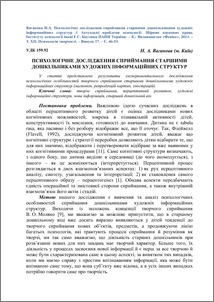 | Keywords: | творче сприймання, перцептивний розвиток, художні інформаційні структури, нова інформація, старший дошкільний вік |