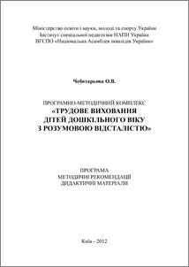Чеботарьова, О. В. (orcid.org/0000-0002-4560-3708) (2012) Program-methodical complex «Labor education of preschool children with mental retardation» . ПрАТ «Видавництво «Київська правда» КП ДАК «Укрвидавполіграфія», м. Київ, Україна. ISBN 978-966-7270-74-2