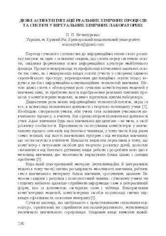- Нечипуренко, Павло Павлович (2012) Some aspects of simulation of real chemical processes and systems in virtual chemical laboratories Theory and methods of e-learning (3). pp. 238-244. ISSN 2309-1495