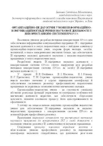 An important condition for the development of a technique of using EPrints to provide communications support for research activities in the field of educational Sciences is the construction of a complex of organizational-pedagogical conditions, in particular forms, methods, tools, technologies, and the allocation of semantic blocks that provide IR support to research activities scientific and scientific-pedagogical workers in the field of pedagogical Sciences. The developed model IR-support research activities using the EPrints system is the basis for the development of a technique of use of the system as a means of EPrints IR support research activities.