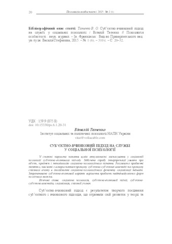 - Татенко, В. О. (2015) Subject-deed approach at the service in social psychology Психологія особистості, 1 (6). pp. 20-32. ISSN 2309-785X