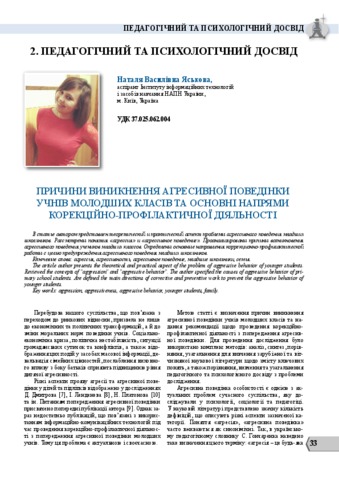 - Яськова, Н.В. (2016) Causes of the aggressive behavior of junior pupils and the main directions of correction and prevention activities Щомісячний науково-методичний журнал «Освіта та розвиток обдарованої особистості» (2). pp. 33-36.