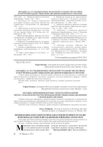 - Михнюк, М.І. (2015) Method of use of gaming technology in the development of professional culture of special disciplines construction profile of teachers Молодь і ринок, 2 (121). pp. 66-70.