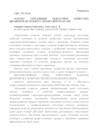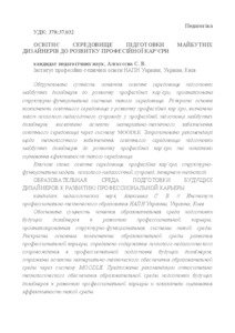 - Алєксєєва, С.В. (2015) Educational environment for preparing future designers for professional career development Науковий огляд, 5 (15). pp. 64-71. ISSN 2311-4509