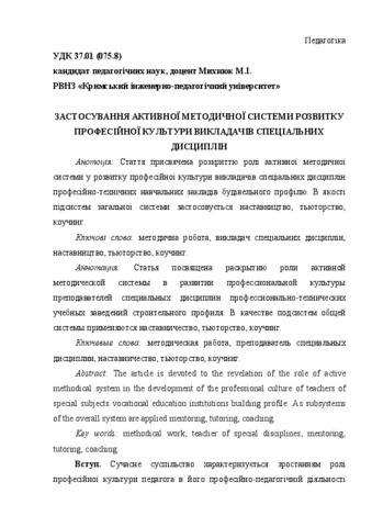 - Михнюк, М.І. (2014) The use of the active methodical system of special disciplines teachers professional culture development Проблеми сучасної педагогічної освіти. Серія: Педагогіка і психологія, 4 (46). pp. 175-180.