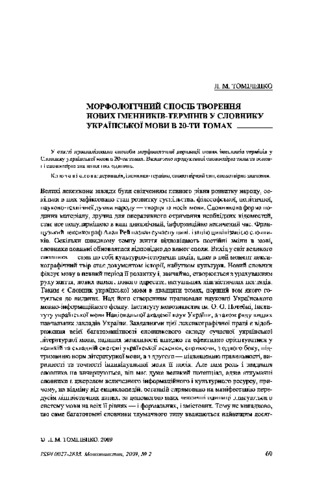 - Томіленко, Л. М. (2009) Morphological derivation of new noun terms in the twenty-volume dictionary of the Ukrainian language Мовознавство, 2. pp. 69-78. ISSN 0027-2833