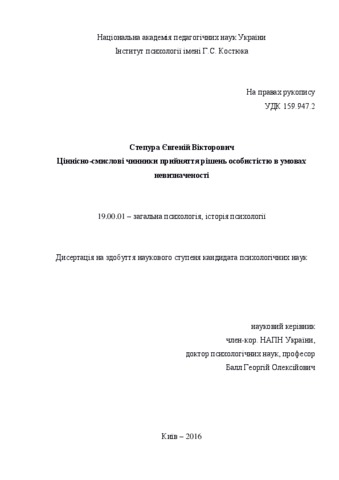 - Степура, Є.В. (orcid.org/0000-0002-7214-0788) (2016) Value-semantic factors of person’s decision making in the conditions of uncertainty Doctoral thesis, Інститут психології імені Г.С. Костюка.