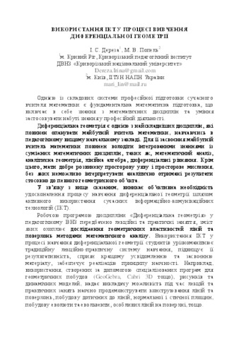 - Попель, М.В. and Дереза, І.С. (2016) The use of ICT in the study of differential geometry In: Новітні комп’ютерні технології , 14 . Видавничий центр ДВНЗ «Криворізький національний університет», м. Кривий Ріг, Україна.