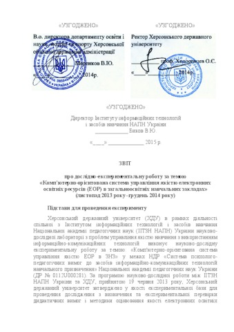 - Співаковський, О.В., Шишкіна, М.П., Кравцов, Г.М. and Носенко, Ю.Г. (2014) Report on the experimental work on "Computer oriented system for quality management of electronic educational resources in secondary schools" (November 2013-December 2014) [Experiment]