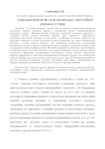 - Слободяник, О.В. (2016) Соціальні мережі як засіб організації самостійної діяльності учнів Наукові записки. Серія: Проблеми методики фізико-математичної і технологічної освіти, 2 (9). pp. 50-57. ISSN 978-966-7406-67-7