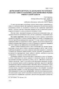 - Калініна, Л.М. and Куценко, Т.М. (2015) Government control of primary school in the content of the guide for managers of different levels in education Проблеми сучасного підручника, 1 (15). pp. 240-253.