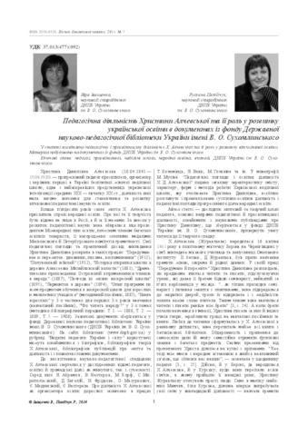 - Іващенко, Віра Миколаївна (orcid.org/0000-0001-7808-7239) and Палійчук, Руслана Іванівна (2014) Educational activity Christina Alchevsk and its role in the development of Ukrainian education in documents from the fund of the State Scientific and Pedagogical Library of Ukraine V. Suchomlynsky Вісник Книжкової Палати (7). pp. 1-4. ISSN 2076-9326