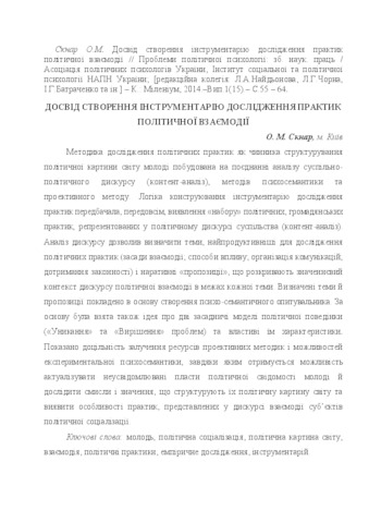 - Скнар, Оксана Миколаївна (orcid.org/0000-0001-7883-680X) (2014) Experience of constructing research instruments of practices of political interaction Проблеми політичної психології, 1 (15). pp. 55-64. ISSN 2411-1449