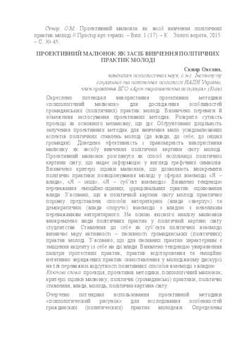 - Скнар, Оксана Миколаївна (orcid.org/0000-0001-7883-680X) (2015) Projective drawing as the research instrument of youth political practices Простір арт-терапії, 1 (17). pp. 30-45. ISSN 2310-3159
