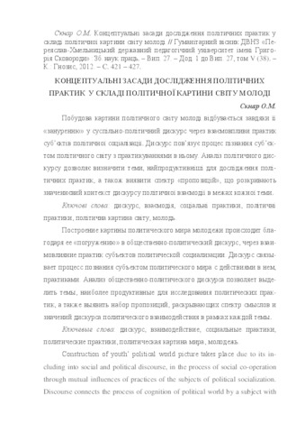 - Скнар, Оксана Миколаївна (orcid.org/0000-0001-7883-680X) (2012) The conceptual basis of the study of political practices in the composition of the youth political world Гуманітарний вісник ДВНЗ «Переяслав-Хмельницький державний педагогічний університет імені Григорія Сковороди», 27 (38). pp. 421-427.