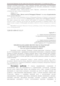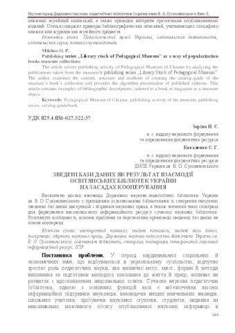 | Keywords: | e-catalogue, V. Sukhomlynskyi State Scientific and Pedagogical Library of Ukraine, cooperation, master databases, master catalogues, dissertations, collected scientific papers, scientific articles, document analysis and synthesis. |