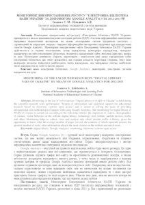 Monitoring of the use of web resources "Digital library of NAES of Ukraine" is held during the scientific-research work performance "System of information and analytical support for educational research based on electronic systems open access" and is aimed at solving the tasks of providing informational and methodological support with using Google Analytics. Site monitoring for digital library of NAES of Ukraine is carried out according to the following criteria: the inspection of visitors, demographics of visitors, visitor behavior on the website digital library, technology visit website, mobile devices, traffic and other. Monitoring helps to collect, view and analyze data about website traffic e-library, gives the opportunity to know what the average number of pages viewed, the contents of which materials ensures the greatest number of visits, what information attracts the most visitors on the website and much more.
