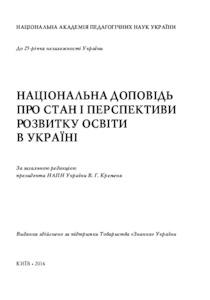 The publication conducted a comprehensive analysis of present state and development of national education for the 25-year period of independence in Ukraine, determined actual problems of the educational sector, revealed their causes, offered evidence-based ways to modernize our education in the context of globalization, European integration and national identity. Meant for the legislators, public administrators, school leaders, teachers and teaching staff, the general public and anyone who aims to increase the competitiveness of Ukrainian education.
