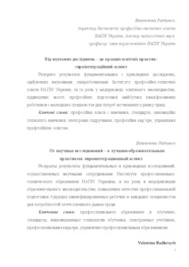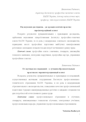 - Радкевич, В.О. (2016) From research – to best educational practices: european integration aspect Професійно-технічна освіта, 2 (71). pp. 31-36.