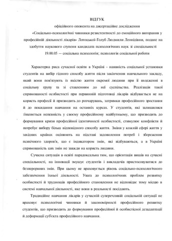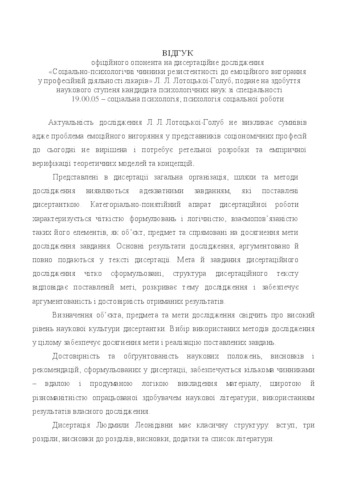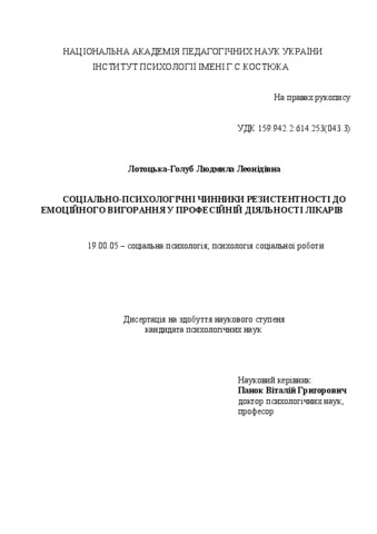 - Лотоцька-Голуб, Л.Л. (2016) Social and psychological factors of resistance to emotional burnout in the profession of doctors Dissertation candidate thesis, Інститут психології імені Г.С. Костюка.