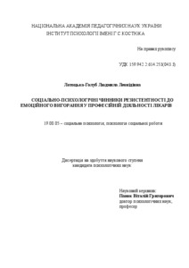 The thesis is devoted to revealing social and psychological factors of resistance to emotional burnout doctors. Determined that the content and structure of the professional activities of doctor associated with resistance to emotional burnout; professional activities of doctor has specific characteristics which substantially reflect the nature, content and specifics of professional activities of doctor; professional doctor - a set of socio-psychological and personality changes that accumulate in the professional activities and provide constructive solutions to complex professional tasks. The results of theoretical analysis, experimental study singled out patterns of behavior (successful and unsuccessful) doctors in the making resistance. Determined that, in contrast to the "successful," "unsuccessful" coping strategies negatively impact on the development of resistance to emotional burnout, crisis will cause deformation of individual and professional doctor. The theoretical model of "resistance to emotional burnout" doctor, the specifics of which is to be aware of their own coping strategies self-diagnostics emotional state, self-regulation and formation of positive patterns of resistance and stress tolerance, solving personal conflicts internally for further self-development and self-improvement. According to this theory proved developed and tested a complex psycho actions aimed at the formation of a "resistance to emotional burnout" doctors. Concretized requirements for professional skills of doctors (formation of "resistance to burnout 'specialist), the disclosure features awareness of these requirements in-house expertise and medical students, to establish communications between their coping strategies and social and psychological characteristics and cognitive stylistic features.