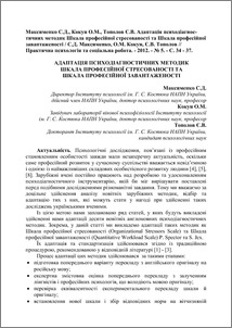 - Максименко, С.Д., Кокун, Олег Матвійович and Тополов, Є.В. (2012) Адаптація психодіагностичних методик Шкала професійної стресованості та Шкала професійної завантаженості Практична психологія та соціальна робота, 5. pp. 34-37.