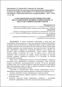 - Максименко, С.Д., Кокун, Олег Матвійович and Тополов, Є.В. (2011) Adaptation of psychodiagnostic methods "Job Search Behaviors Scale" and "Negative Affect at Work Scale" Практична психологія та соціальна робота, 10 (155). pp. 34-38. ISSN 2307-5880