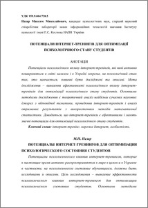Potentials of internet-trainings’ psychological influence which presently actively spread in the world on the whole and in Ukraine in particular, on the students psychological state, must be investigated and described. A research purpose is an exposure of efficiency of internet-trainings’ psychological influence for students’ psychological state optimization. The basic methods of research are theoretical analysis of modern scientific sources on the proper subject, leadthrough of internet-trainings and analysis of the got results with the use of mathematical statistics’ methods. Proved, that internet-trainings are effective and possess considerable potentials for students’ psychological state optimization.