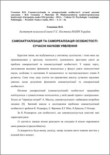 - Гомонюк, В.О. (2013) Самоактуалізація та самореалізація особистості: сучасні наукові уявлення In: Materialy ІХ Międzynarodowej naukowi-praktycznej konferencji «Europejska nauka XXI powieka – 2013». – Volume 22: Psychologia i socjologia. Politologija . Nauka i studia, Польща, Przemisl, Польща, pp. 21-26. ISBN 978-966-8736-05-6