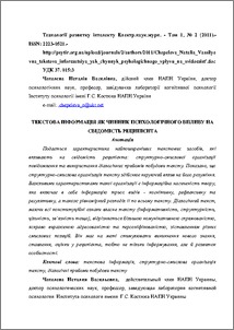 - Чепелєва, Н.В. (2011) Текстова інформація як чиниик психологічного впливу на свідомість реціпієнта Технології розвитку інтелекту, 2 (Том 1). ISSN ISSN 2223-0521