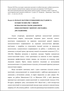 The proposed article is one of the sections methodical recommendations established by a group of authors. In the author section presents empirical evidence on the impact of cultural-related attitudes and personality traits to choose the style of a psychologist to assist cancer patients. The application provides methods of research.