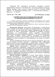 - Медведева, Н.В. (2013) Art information structures perception by junior pupils Актуальні проблеми психології: Збірник наукових праць Інституту психології імені Г. С. Костюка НАПН України, Т. ХІІ. Психологія творчості. (16). pp. 254-259. ISSN 2072-4772