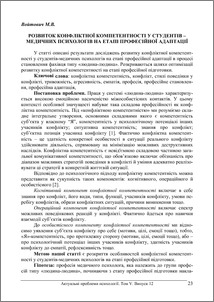 - Войтович, Марія Володимирівна (2012) Розвиток конфліктної компетентності у студентів-медичних психологів на етапі професійної адаптації Актуальні проблеми психології: Збірник наукових праць Інституту психології імені Г.С. Костюка НАПН України. – Том. V: Психофізіологія. Психологія праці. Експериментальна психологія. (12). pp. 23-31. ISSN 2072-4772