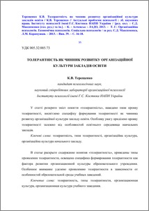 - Терещенко, К.В. (orcid.org/0000-0002-1149-2704) (2013) Tolerance as a factor of organizational culture of educational institutions Актуальні проблеми психології, 39 (1). pp. 16-18. ISSN 2072-4772