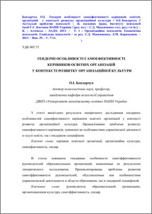 - Бондарчук, О.І. (orcid.org/0000-0003-3920-242X) (2013) Gender-specific distinctive features of self-efficacy of heads of educational institutions in the context of organizational culture Актуальні проблеми психології : зб. наукових праць Інституту психології імені Г.С. Костюка НАПН України. – Т. І : Організаційна психологія. Економічна психологія. Соціальна психологія, 39. pp. 7-11. ISSN 2072-4772