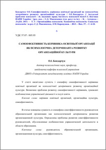 - Бондарчук, О.І. (orcid.org/0000-0003-3920-242X) (2013) Self-efficacy of heads of educational organizations as a psychological determinant of organizational culture Актуальні проблеми психології : зб. наукових праць Інституту психології імені Г.С. Костюка НАПН України. – Т. І : Організаційна психологія. Економічна психологія. Соціальна психологія, 37. pp. 6-10. ISSN 2072-4772