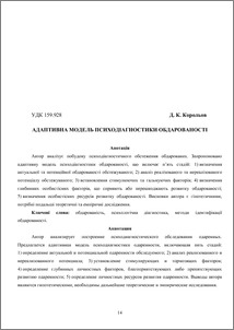 Автор аналізує побудову психодіагностичного обстеження обдарованих. Запропоновано адаптивну модель психодіагностики обдарованості, що включає п’ять стадій: 1) визначення актуальної та потенційної обдарованості обстежуваного; 2) аналіз реалізованого та нереалізованого потенціалу обстежуваного; 3) встановлення стимулюючих та гальмуючих факторів; 4) визначення глибинних особистісних факторів, що сприяють або перешкоджають розвитку обдарованості; 5) визначення особистісних ресурсів розвитку обдарованості. Висновки автора є гіпотетичними, потрібні подальші теоретичні та емпіричні дослідження.