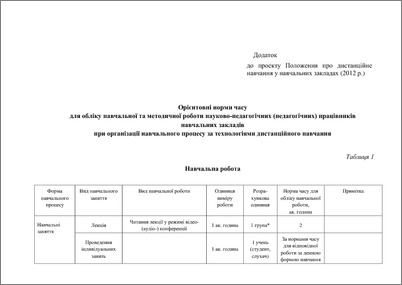 Документ "Орієнтовні норми часу для обліку навчальної та методичної роботи науково-педагогічних (педагогічних) працівників навчальних закладів при організації навчального процесу за технологіями дистанційного навчання" - є додатком до проекту Положення про дистанційне навчання у навчальних закладах (2012 р.), який було підготовлено співробітниками ІІТЗН НАПН України і подано в Інститут інноваційних технологій і змісту освіти МОН України у 2012 році.