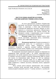 A “Ukrainian Sign Language Dictionary for Parents” educational supply is presented in this article; a conceptual attitude and structure of the educational supply is indicated as to representation of material from the point of view of linguistic features of natural sign units and their variants on thematic principle. Foundation is done of this manual assignation for hearing parents who bring up a child with violations of hearing under the conditions of inclusive studies.